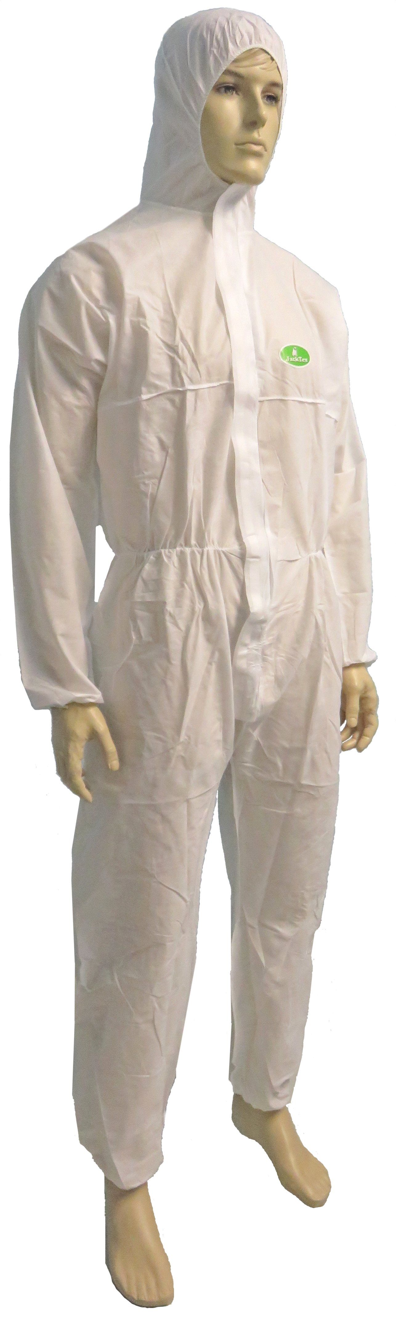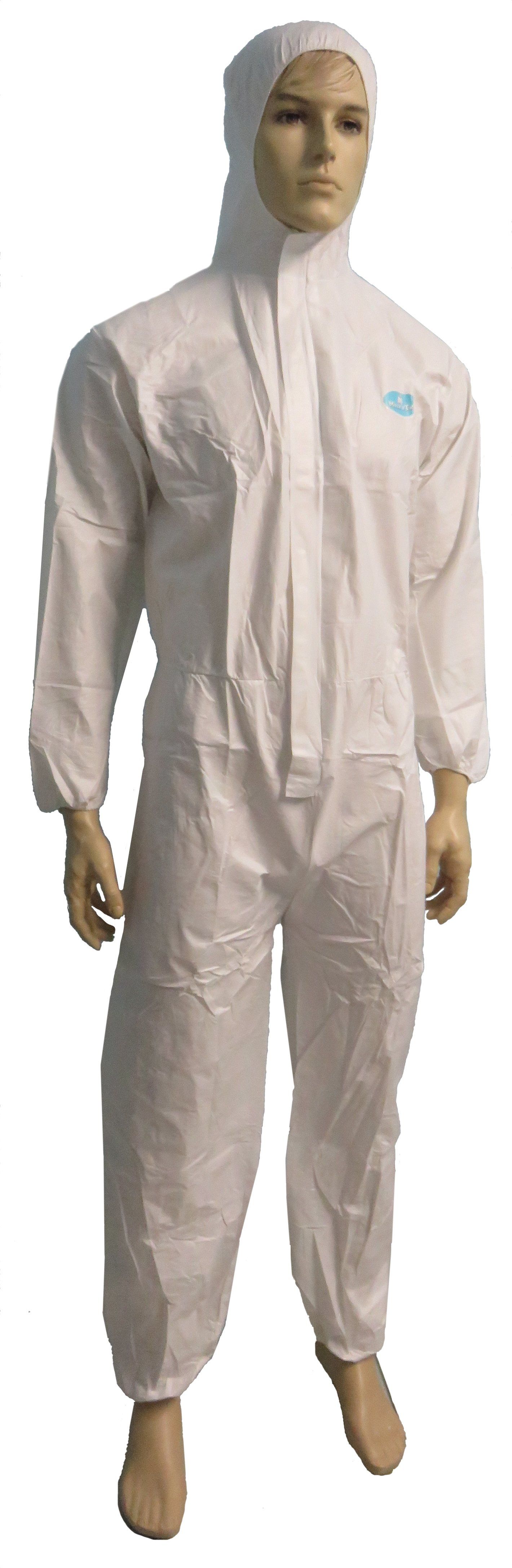 Kit sterile composto da tuta Microtex® monouso senza cappuccio colore bianco, cappuccio a scafandro Microtex® bianco con mascherina incorporata, calzari Microtex® bianchi con suola antiscivolo.